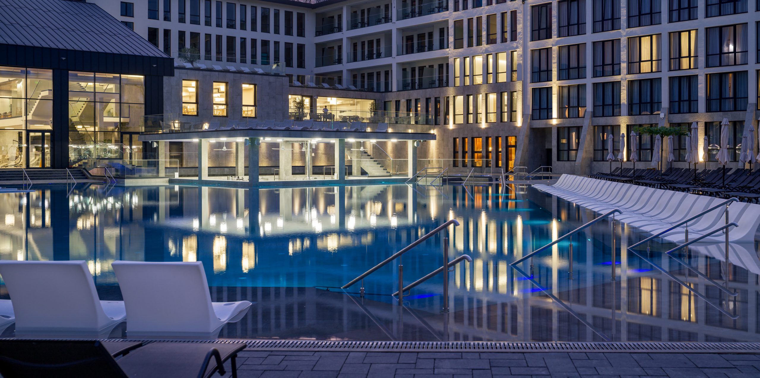 З настанням вечора простір RIKKA набуває нового звучання — підсвічування басейнів, пара над водою, силуети гостей у тиші.